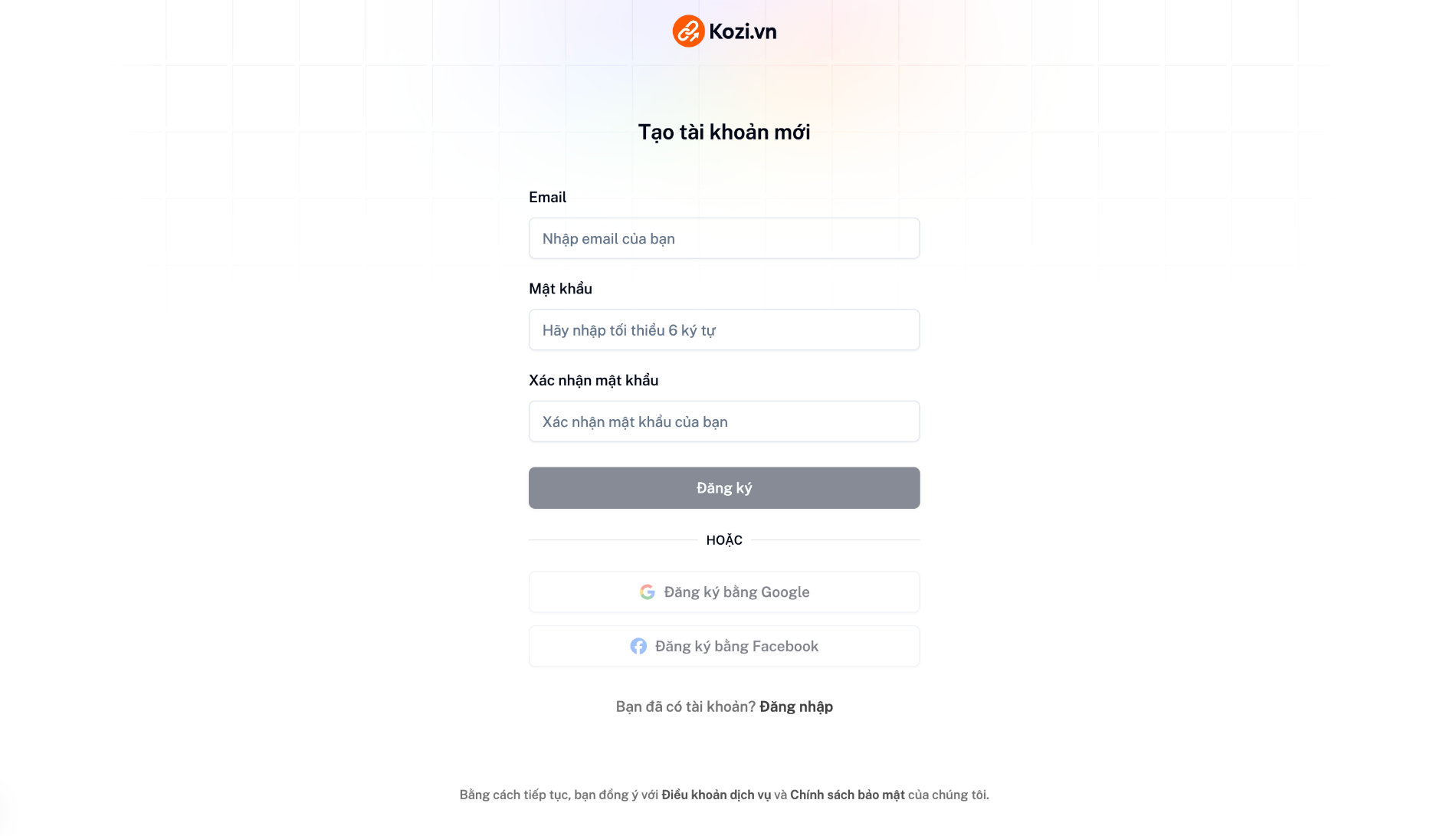 - Đăng ký và Thiết lập Tài khoản: Truy cập Kozi.vn và đăng ký.